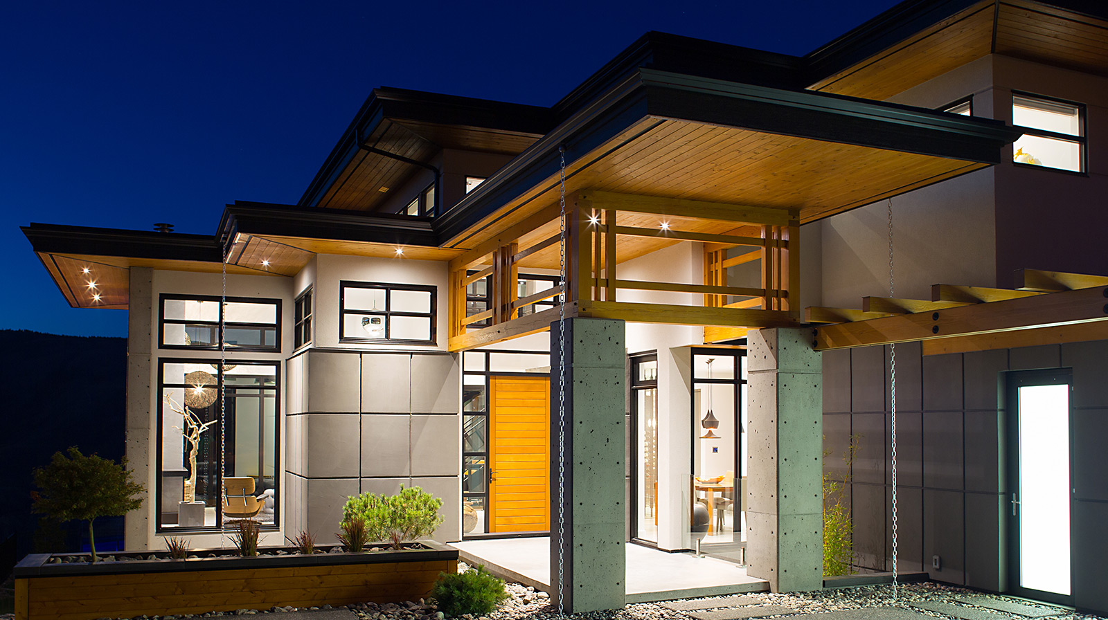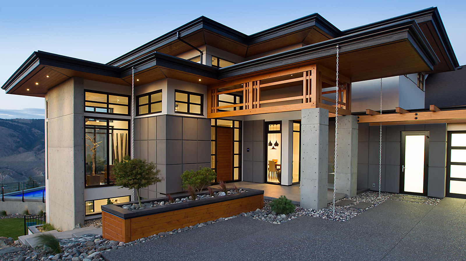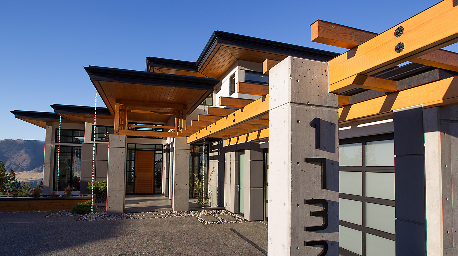 Wood joinery elements, using kiln-dried Douglas Fir, emphasize the modern designed exterior of this gorgeous home in Kamloops, BC. Daizen provided fine joinery in the Japanese “Ramma” tradition to create a unique front entrance that accentuates the combination of concrete and wood materials and provides an open, minimalist atmosphere.