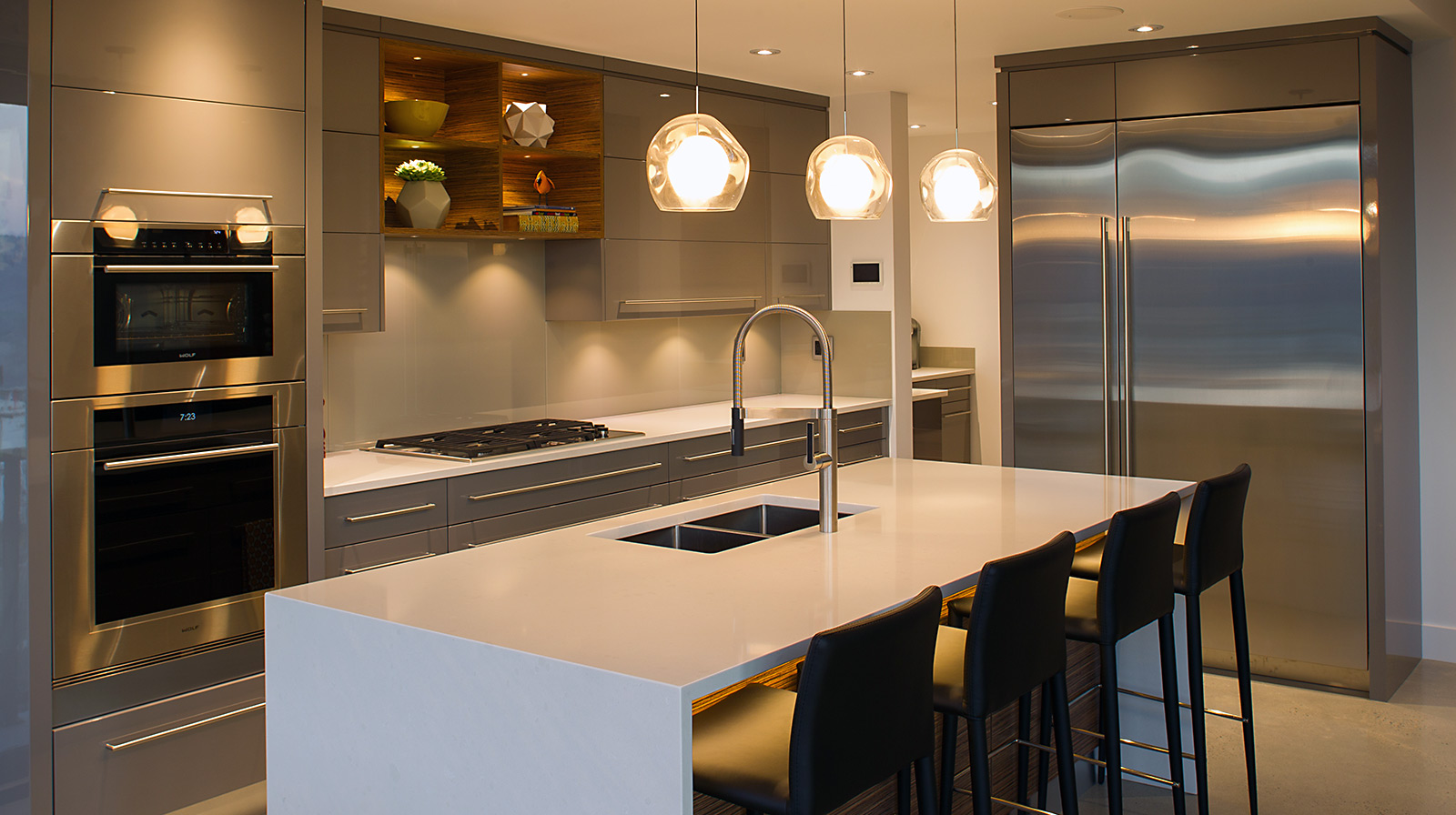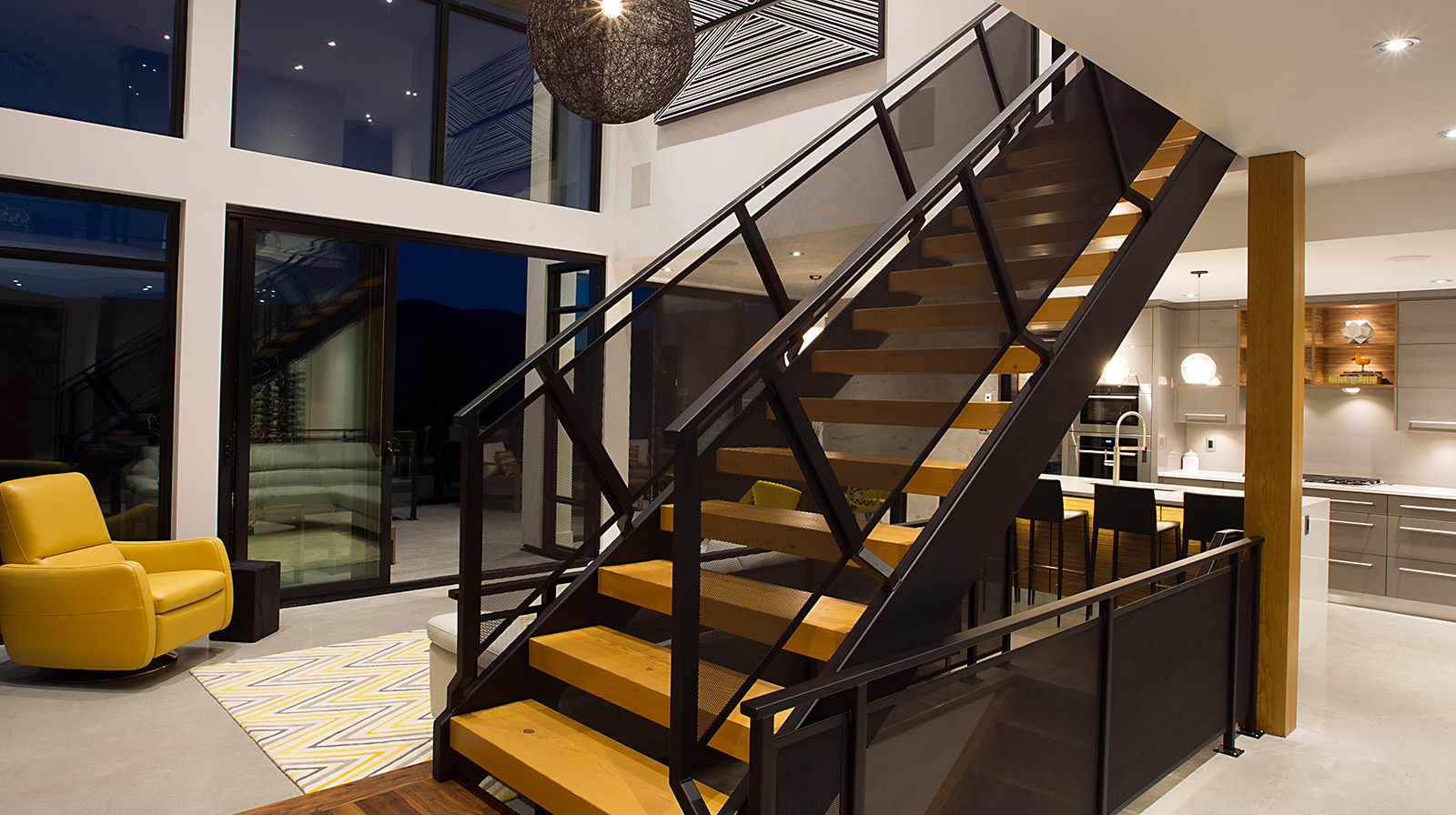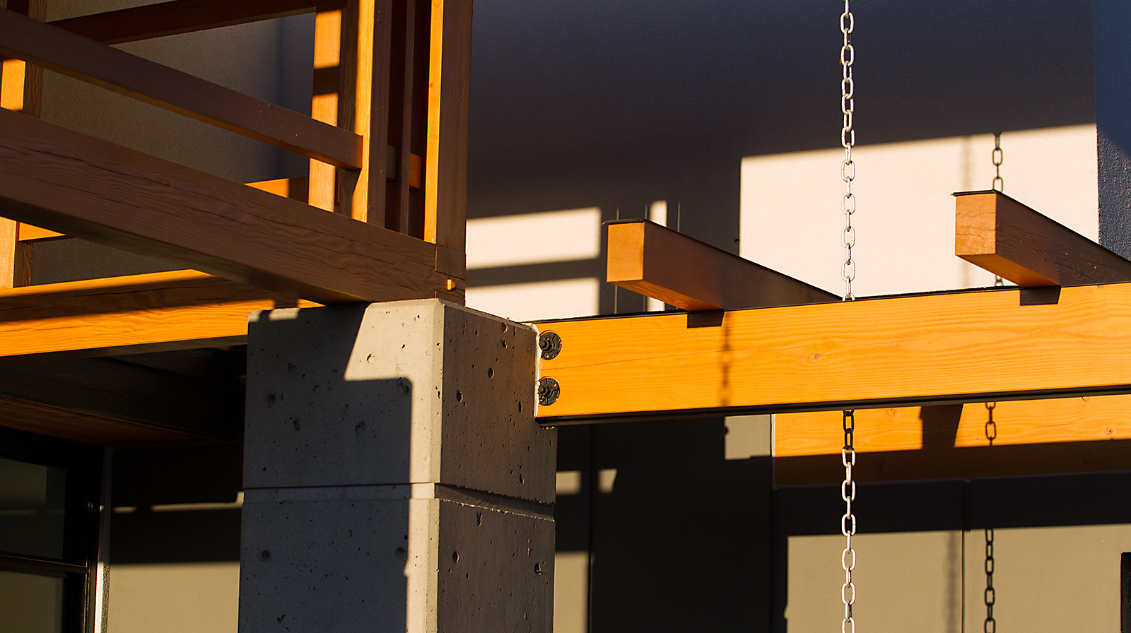 Wood joinery elements, using kiln-dried Douglas Fir, emphasize the modern designed exterior of this gorgeous home in Kamloops, BC. Daizen provided fine joinery in the Japanese “Ramma” tradition to create a unique front entrance that accentuates the combination of concrete and wood materials and provides an open, minimalist atmosphere.
